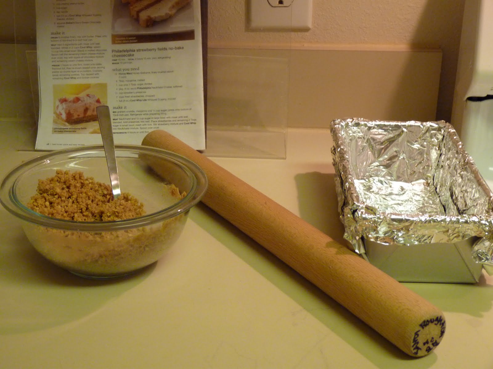 On the right, you'll see your standard smothered in foil bread pan. That's buttery, cookie, crushed goodness there on the left and a good 'ol whackin' stick in the middle (aka my rolling pin).
